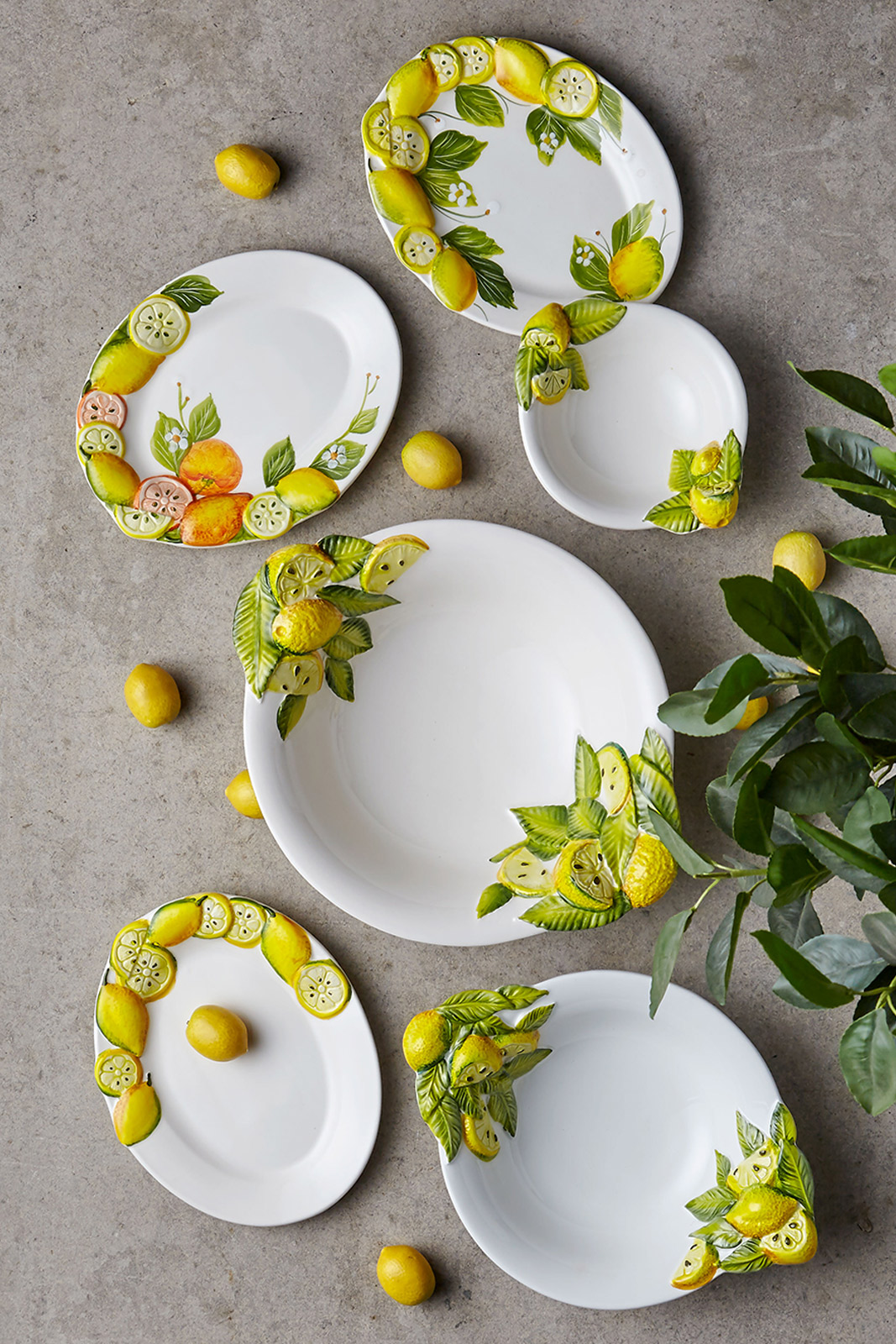 Limonların canlı sarısı, papatyaların sade beyazı ve doğadan ilham alan renk paletiyle hazırlanan tabaklar, kaseler ve sunum tabakları, sıradan bir kahvaltıyı bile adeta bir ritüele dönüştürüyor. Sıcacık bir yaz sabahında, limon desenli bir servis tabağı üzerine koyduğunuz taze kekle hem gözleri hem de damakları şımartabilirsiniz.