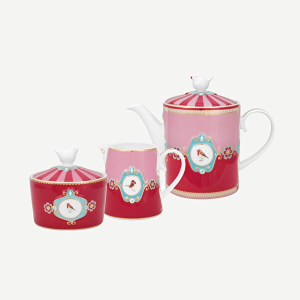 Kırmızı Porselen Demlik Sütlük Şekerlik 3 Parça